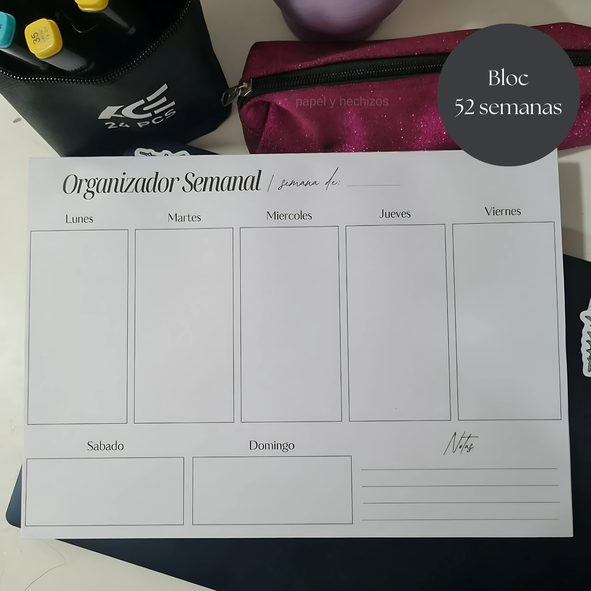 Planificá tu semana con estilo y practicidad. Este bloc en formato A4 incluye 52 hojas desprendibles, pensadas para que organices cada día del año de manera sencilla.