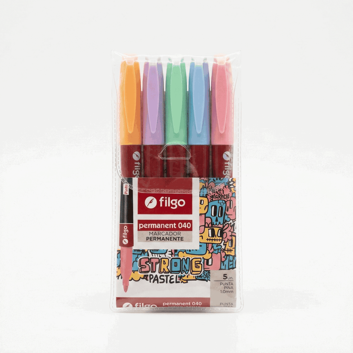 Set de 5 marcadores permanentes Filgo Strong en tonos pastel, ideales para escribir y marcar sobre múltiples superficies 🖊️🌈